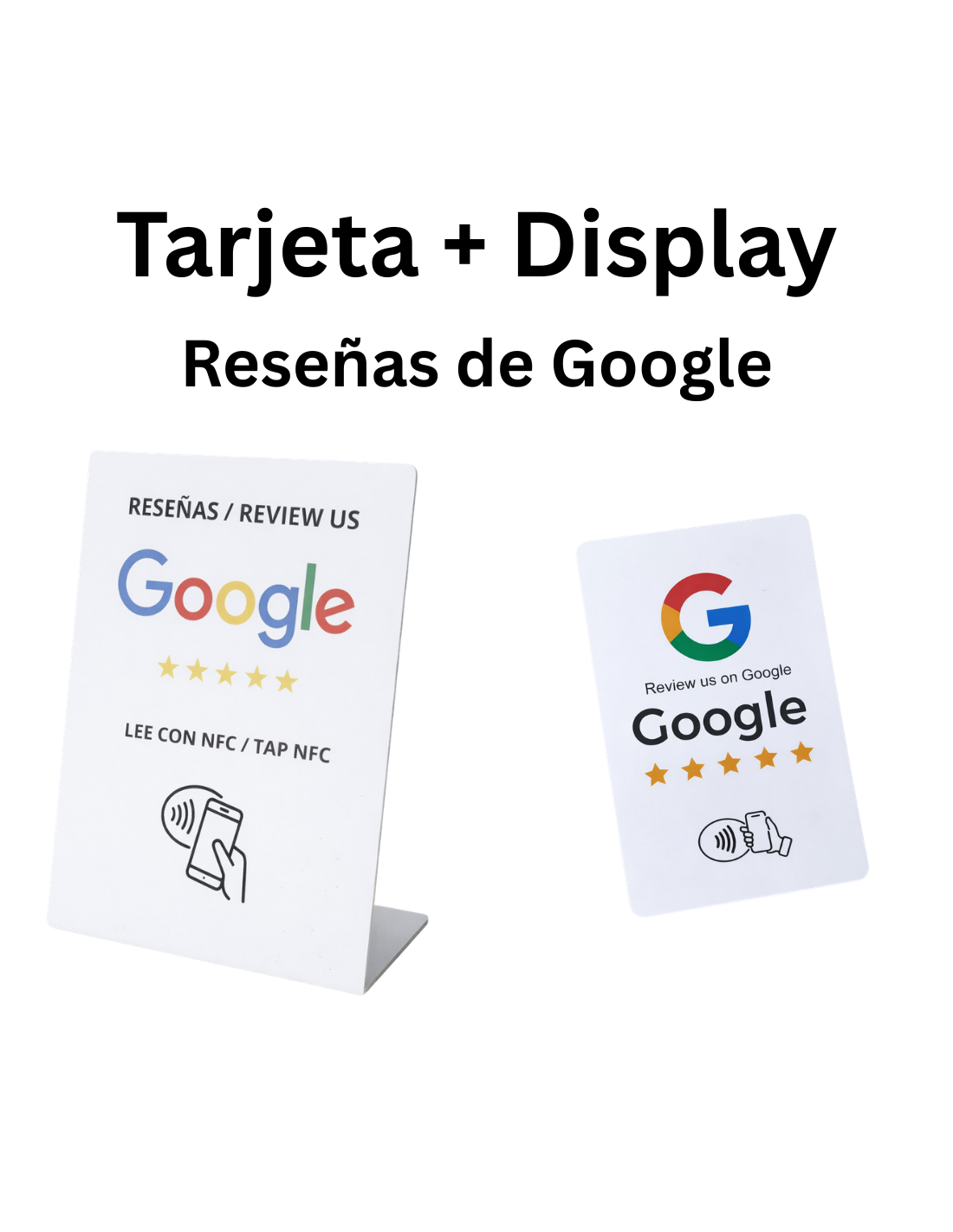 Kit completo para conseguir reseñas en Google: incluye display NFC de sobremesa para el mostrador + tarjeta NFC para llevar contigo o usar con tu equipo.