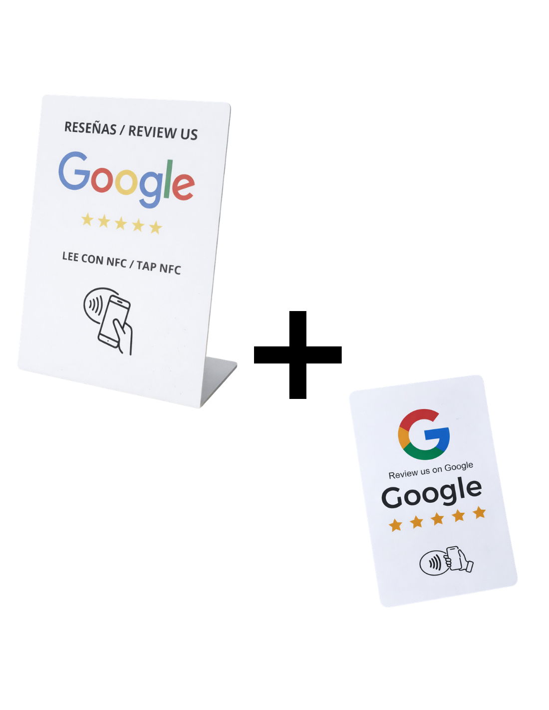 Más reseñas, más fácil, en más situaciones. Este pack combina dos formatos para cubrir el 100% del día a día: un display de sobremesa siempre visible en el local y una tarjeta NFC para que el equipo pueda pedir reseñas de forma natural en cualquier punto.